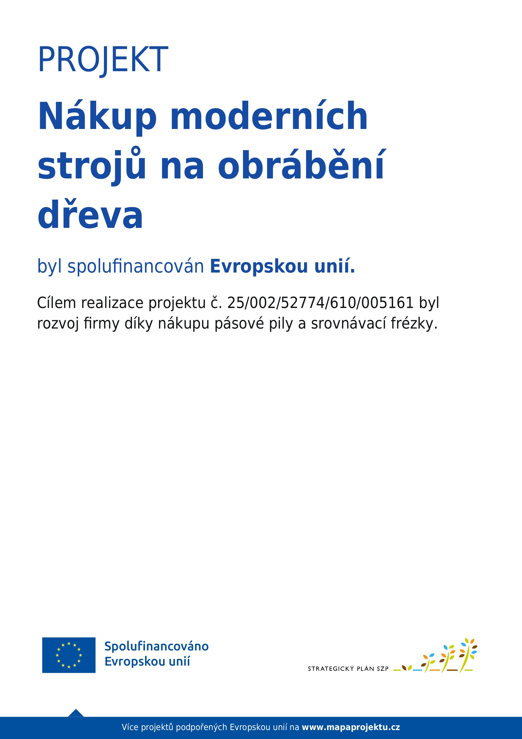 V rámci projektu „Nákup moderních strojů na obrábění dřeva“, spolufinancovaného Evropskou unií, jsme rozšířili naše technologické vybavení o pásovou pilu a srovnávací frézku. Díky této investici jsme schopni dosahovat vyšší přesnosti výroby, zefektivnit procesy a nabídnout zákazníkům kvalitnější výstupy.